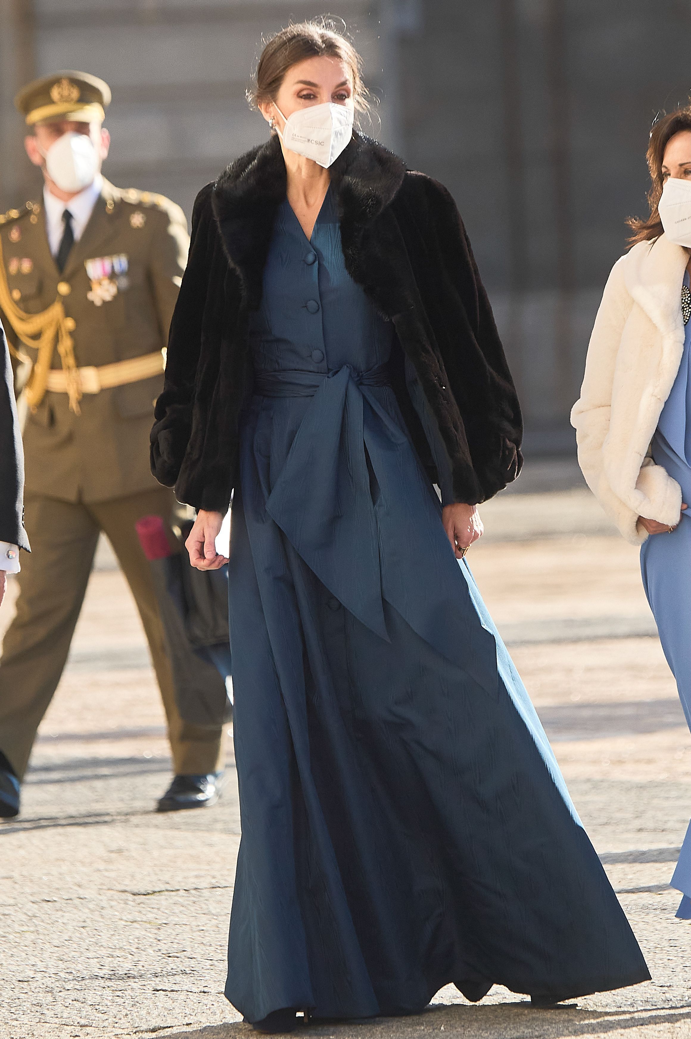Tradicija kaže da kraljica treba da nosi haljinu do poda za ovu priliku. Leticija je zato odabrala veličanstvenu tamnoplavu haljinu. Haljina je u potpunost zatvorena, a oko struka ima mašnu koja je naglasila njenu siluetu. Teget haljinu kombinovala je sa crnom kraćom bundom. Kosu je skupila u elegantnu nisku punđu