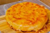 Dodati drugu i nju isto tako i treću pa na nju razbacati rendane jabuke sa suvim grožđem i rasporediti po neku višnju. Saviti sa strane i uviti u rolat. Ređati jednu do druge u pleh obložen pek papirom.